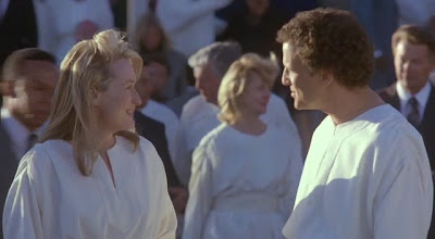 Albert Brooks is a very smart writer. He wouldn't create your typical Hollywood love story and send it through the recycling machine. His approach to love in this film is totally random, somewhat sporadic, but yet honestly real. There is a mystery between he and Meryl Streep's relationship. That is what I loved so much about them. Typically in films of this nature you have this elaborate story of how two people meet, they fall in love, they fight, and suddenly discover that their passion is stronger than ever before (normally due to some unforeseen ... or clichéd moment), but not in this film. Brooks approaches love as if it already exists. He hints towards the notion that these two may have been in Judgment City before, that maybe they have already had their awkward courtship, that maybe the climactic cliché has already happened, and now they are just rediscovering themselves. Brooks sets this up with Streep's first lines, which are simply, "Haven't we met before?" While this may not seem like it is that exciting, the fact that they are in Judgment City after dying, and two random people recognize each other is heartwarming. I was immediately attached to these two characters from the moment they met in the Comedy Club. Their emotions didn't seem created by Hollywood, but instead created by the brilliant craftsmanship of Brooks' words. If you aren't connected to the courtroom antics of this film, than the spark that Streep creates with Brooks will surely keep you grounded for good.